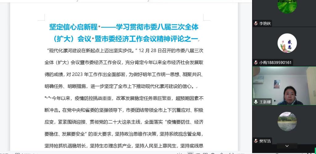 会议第一项,开展专题学习。王新娜副书记带领大家进行专题学习,学习认真学习习近平总书记二〇二三年新年贺词;学习中央经济工作会议、省委经济工作会议精神;学习传达全市“两会”精神。