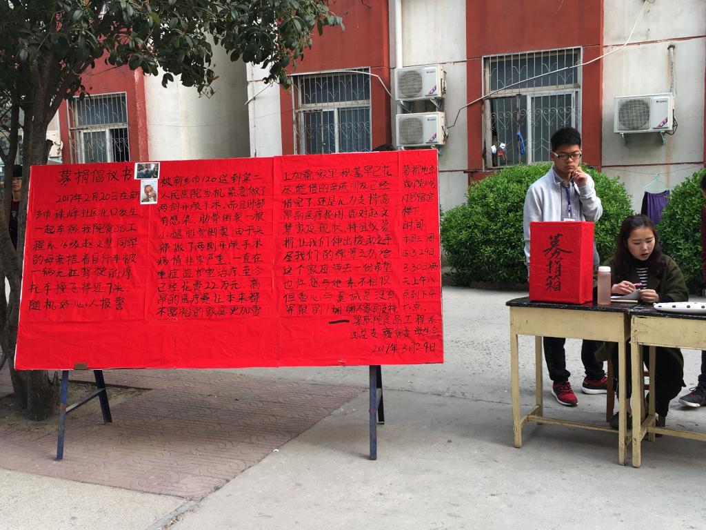 2017年2月20日在新乡市珠峰社区北口发生一起车祸,公司食品工程系16级赵文慧同学的母亲推着自行车被一辆无证驾驶的摩托车撞飞将近7米,事故发生后被紧急送往新乡市第二人民医院抢救,做了两侧开颅手术,肺部感染,一根肋骨断裂,小腿腓骨断裂,病情非常严重,在重症监护室至今尚未苏醒,目前医疗费已经高达22万元。高昂的医疗费让这个本来就不富裕的家庭更加雪上加霜。家里积蓄已经花完,能借的亲戚朋友已经借完,却还是凑不齐高昂的医疗费用。