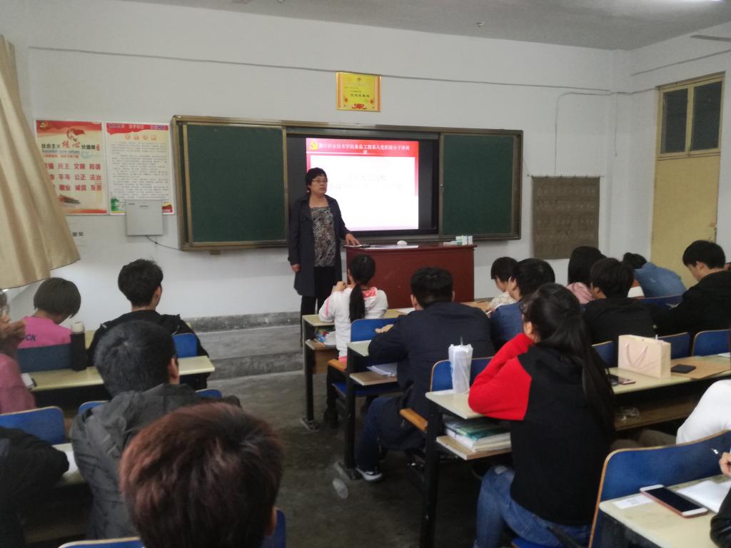 为切实做好入党积极分子的培养工作,帮助入党积极分子端正入党动机,掌握党的基本理论和基本知识,深入学习习近平新时代中国特色社会主义思想,2018年4月17日,食品工程系党总支书田玉枝为第四十二期入党积极分子培训班学员讲了一堂生动、深刻的党课。食品工程系第四十二期全体入党积极分子以及党支部委员们参加本次党课。