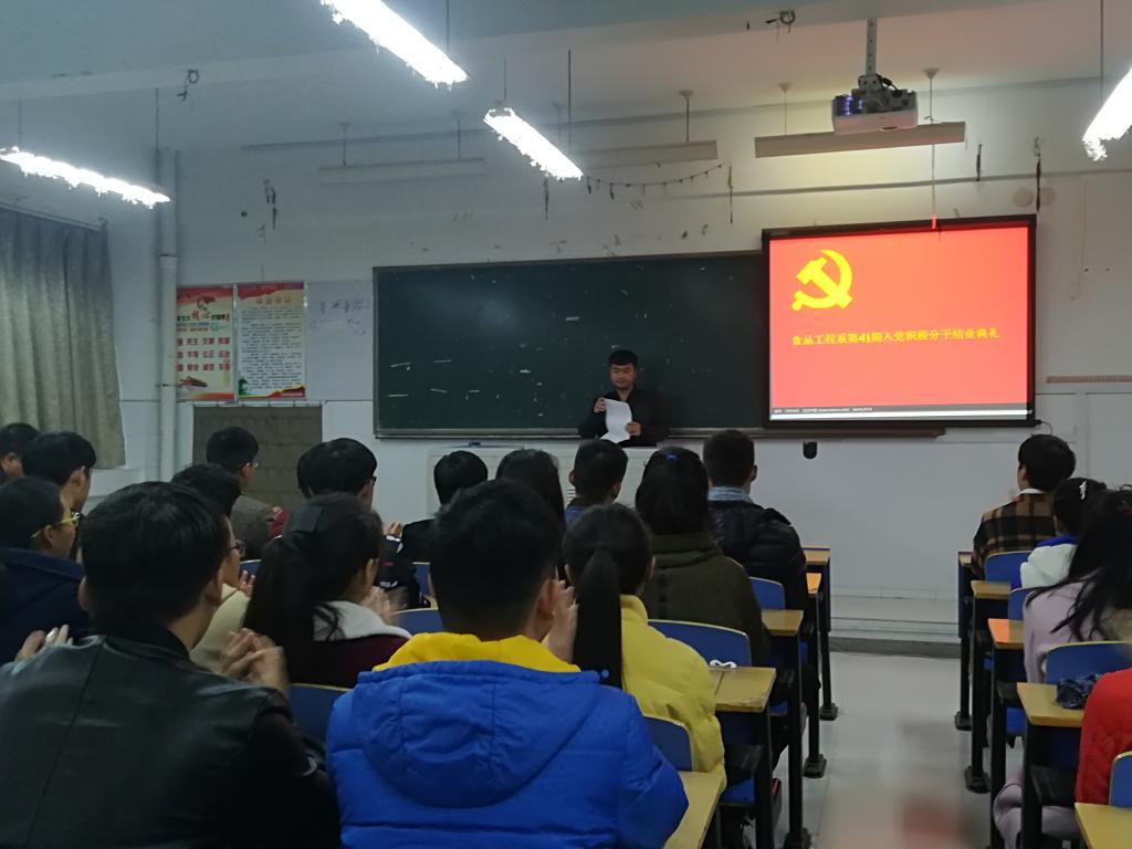 11月17日中共beats365官方网站食品工程系党总支在3号楼404教室隆重举行了beats365官方网站食品工程系第41期入党积极分子结业典礼,食品工程系党总支书记叶桂娥、员工党支部书记王文甫、员工党支部纪检委员韩磊出席本次典礼。