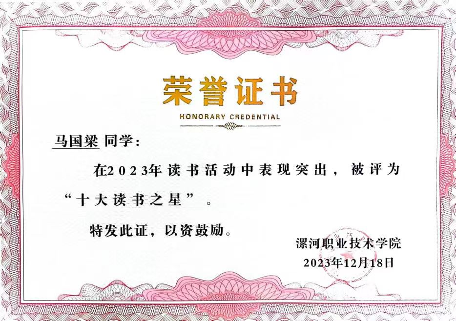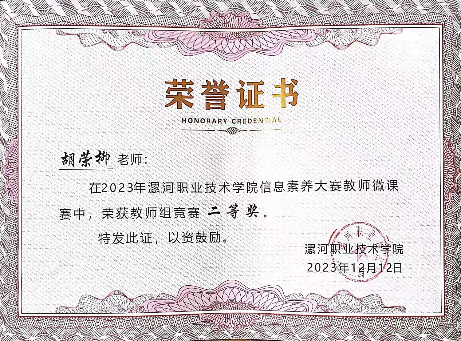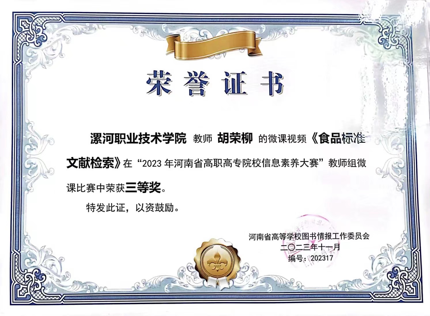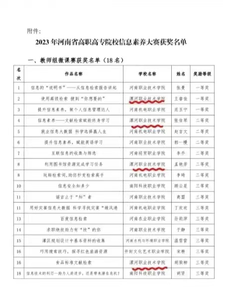 近日,2023年河南省高职高专院校信息素养大赛成绩揭晓。此次大赛中,全省教师组微课赛共计获奖18名,我系教师胡荣柳荣获三等奖,并在beats365官方网站2023年信息素养大赛中荣获二等奖。我系员工马国梁在校园读书之星活动中荣获全校十大读书之星。