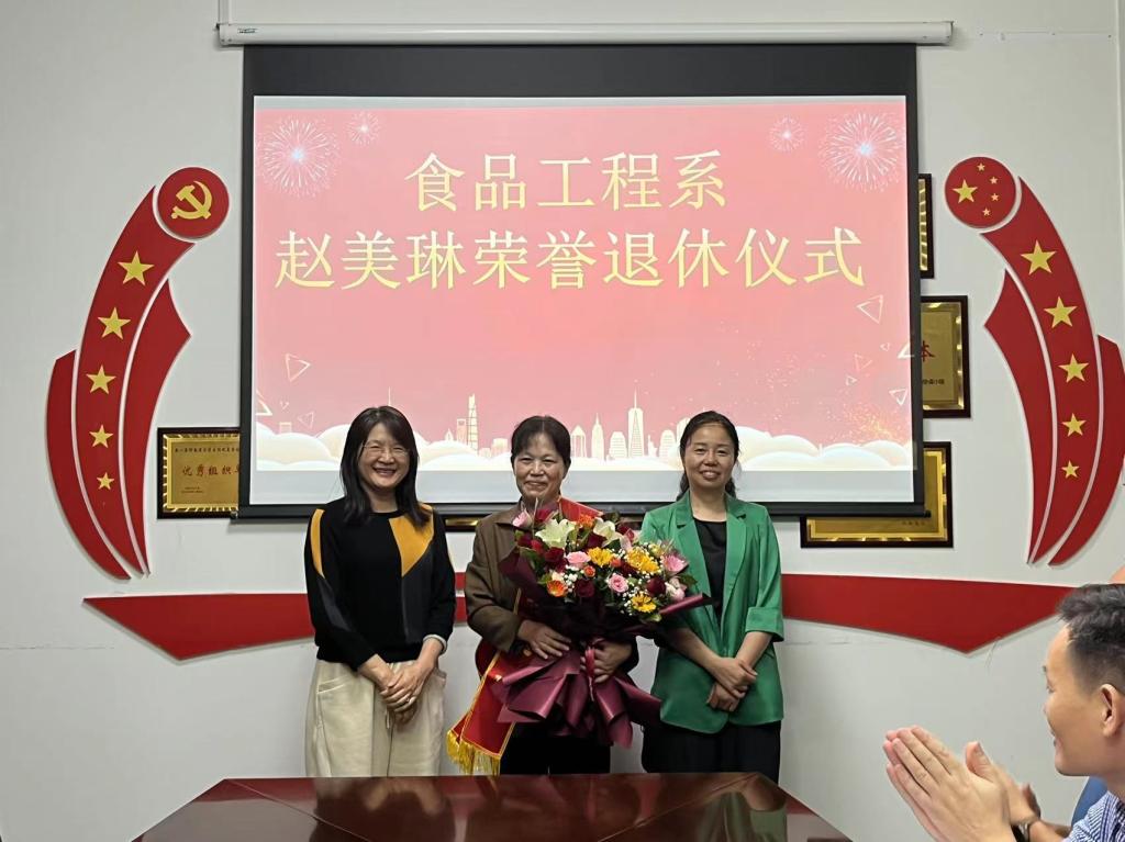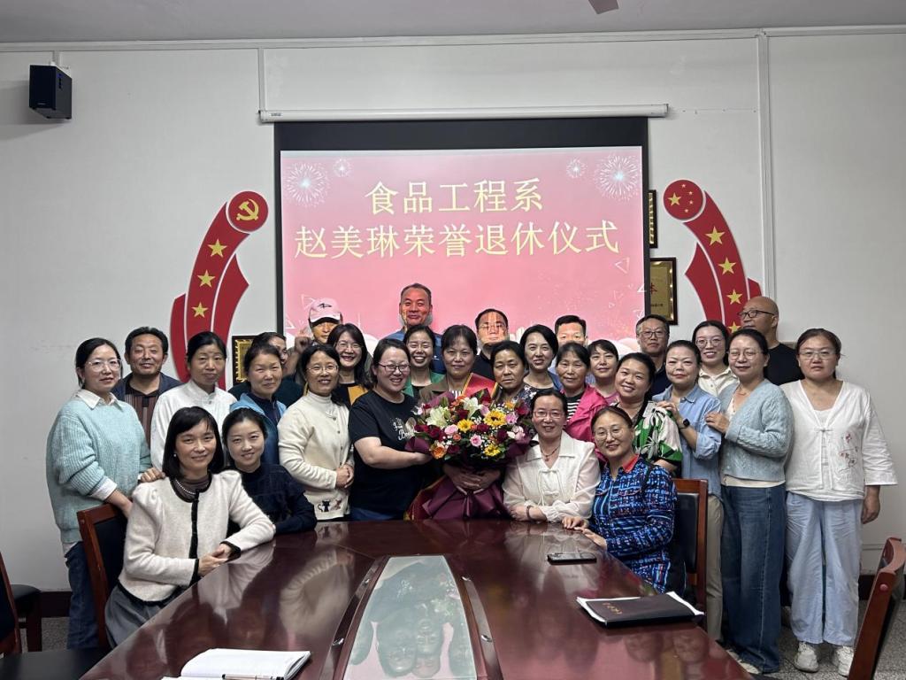 10月16日下午,食品工程系举行荣誉退休仪式,欢送赵美琳老师荣誉退休。食品工程系行政负责人崔惠玲主持仪式,党总支负责人王新娜和全体教师出席了仪式。