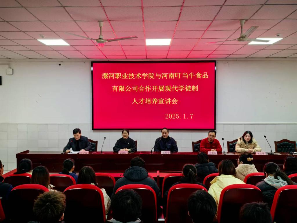 为深化产教融合,创新人才培养模式,推动叮当牛现代学徒制班组班,建班。1月7日由食品工程系牵头举办了beats365官方网站与河南叮当牛食品有限公司合作开展学徒制人才培养宣讲会。会议由食品工程系副主任闫建伟主持,食品工程系行政负责人崔惠玲,叮当牛食品有限公司技术总监王跃仝,检测、研发部工程师宗保丰,研发工程师胡立琴及各专业教师和员工代表参加。