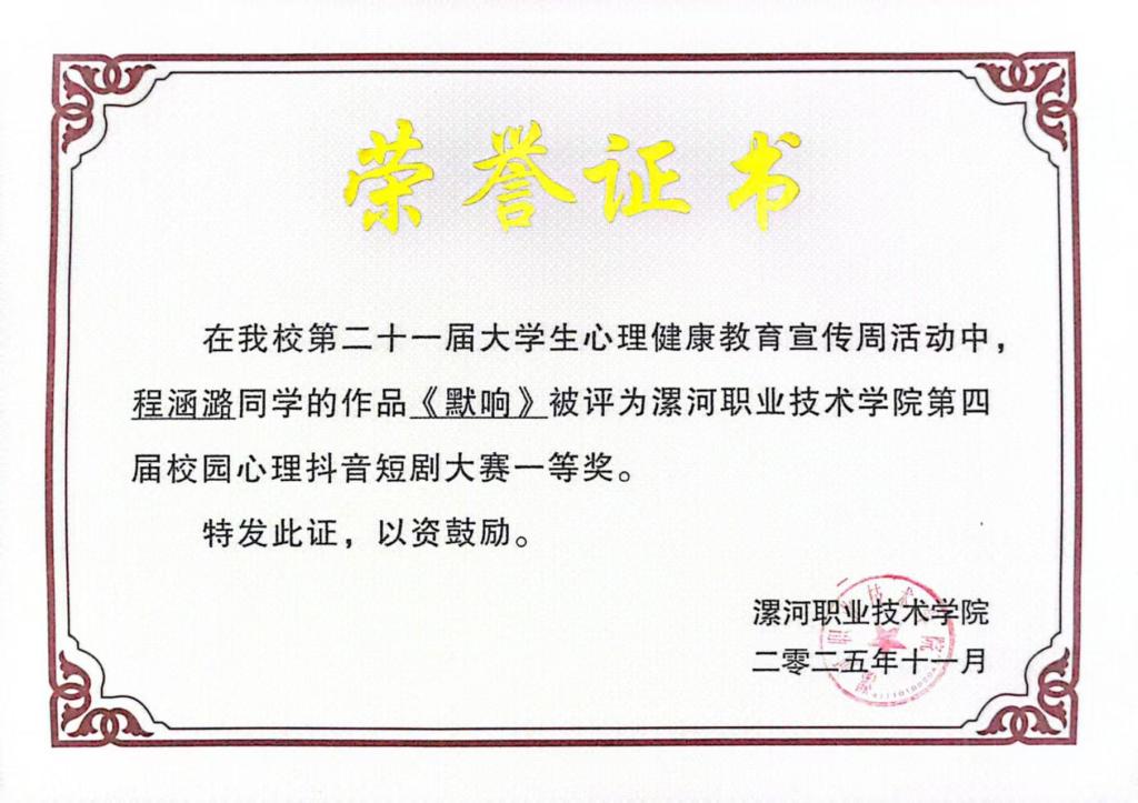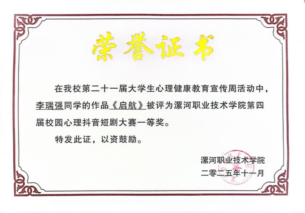 本次大赛以“心光引路,青春启航”为主题,鼓励学子通过短视频形式探索内心世界、传递正向情绪。公司学子积极响应,围绕自我认知、青春成长、情绪调节等维度展开创作,将专业视角与心理关怀巧妙融合。其中,程涵潞同学创作的《默响》与李瑞强同学创作的《启航》凭借细腻的剧情设计、真挚的情感表达,双双斩获大赛一等奖;张青喆同学的作品《拾心光万倾,赴青春一场》则以清新的叙事风格与积极的价值导向,荣获二等奖。