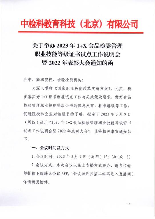 关于举办2023年1+X食品检验管理职业技能等级证书试点工作说明会暨2022年表彰大会通知的函