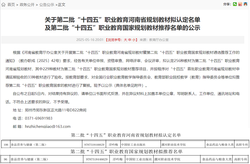 近日,河南省教育厅办公室发布了《关于第二批“十四五”职业教育河南省规划教材拟认定名单及第二批“十四五”职业教育国家规划教材推荐名单的公示》。由浮吟梅、邢淑婕主编的《食品营养与健康(第二版)》教材入选“十四五”职业教育河南省规划教材名单,同时被拟定推荐为第二批“十四五”职业教育国家规划教材。