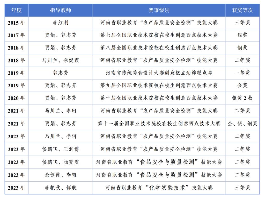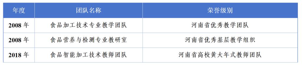 根据专业建设、课程改革、校企合作的实际需要,通过国培、省培、校本培训、下企业锻炼、技能培训、专业建设与课程改革专题培训等多种形式,采取外聘与内培相结合的措施,以专业带头人为引领,以培养骨干教师、提高“双师”结构教师的素质和优化“双师”结构为重点,提升双师素质教师教学与实践能力,目前已经建设成一支教学水平高、实践能力强、结构合理、专兼结合的“双师”结构教师队伍。2008年,食品加工技术专业教学团队获河南省优秀教学团队;2018年食品营养与检测专业教研室被评为河南省优秀基层教学组织;2023年食品智能加工技术教师团队被评为河南省高校黄大年式教师团队;2023年beats365官方网站先后成为河南省轻工纺织骨干职业教育集团检验检测专业建设委员会主任单位、全国农产食品行业产教融合共同体副理事长单位、全国农产食品行业产教融合共同体食品检验检测专业建设委员会主任单位、河南省农产品加工与贮藏工程学会理事单位。